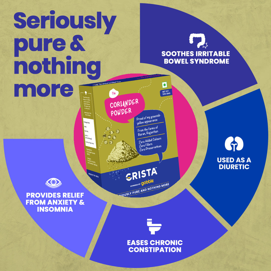 Hey! Its me Coriander Powder. Proud of: My greenish-yellow appearance. Premium grade, bold, sweety-aromatic Coriander (Dhaniya) is sourced from the farms of Rajasthan. Utmost care is taken in procuring the right greenish-yellow colour and liter weight of the spice. Once sourced, the spice is transported to the factory where the seeds are cleaned and processed to eliminate any extraneous matter, before being freshly machine ground into a powder using our sophisticated hammer crushers and micro pulverisers. The final step is mixing in an automatic GMP blender to achieve the desired texture and consistency.