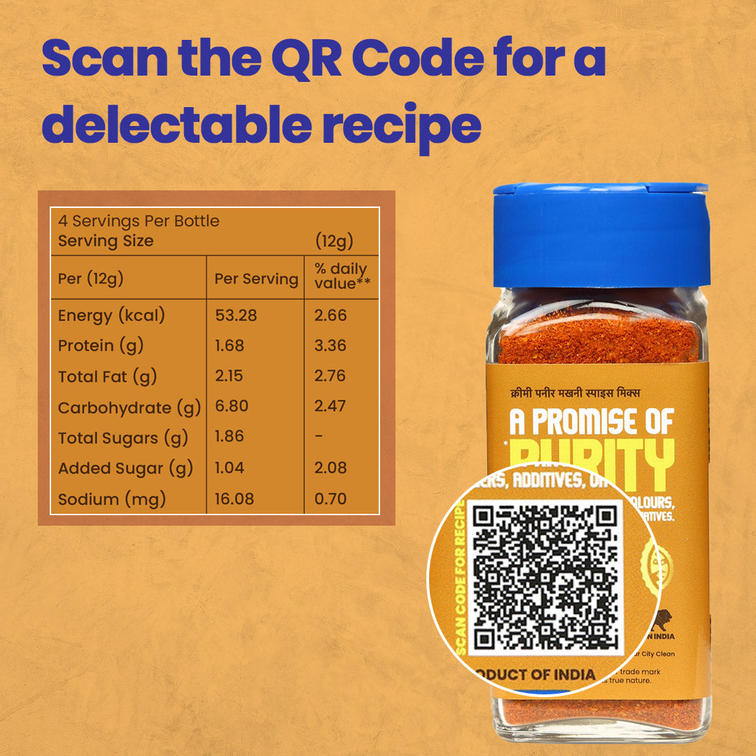 Hey! It's me, Creamy Paneer Makhani Spice Mix. The name 'Makhani' was conjoined during the Mughal era. This kitchen essential is perfect for paneer, vegetables, or chicken and generally pairs exceptionally well with any Punjabi dish. It has a delicious creamy Indian flavor. Freshly machine ground using our sophisticated hammer crushers and micro pulverisers, the blend is mixed in an automatic GMP blender to achieve the desired balance and consistency.