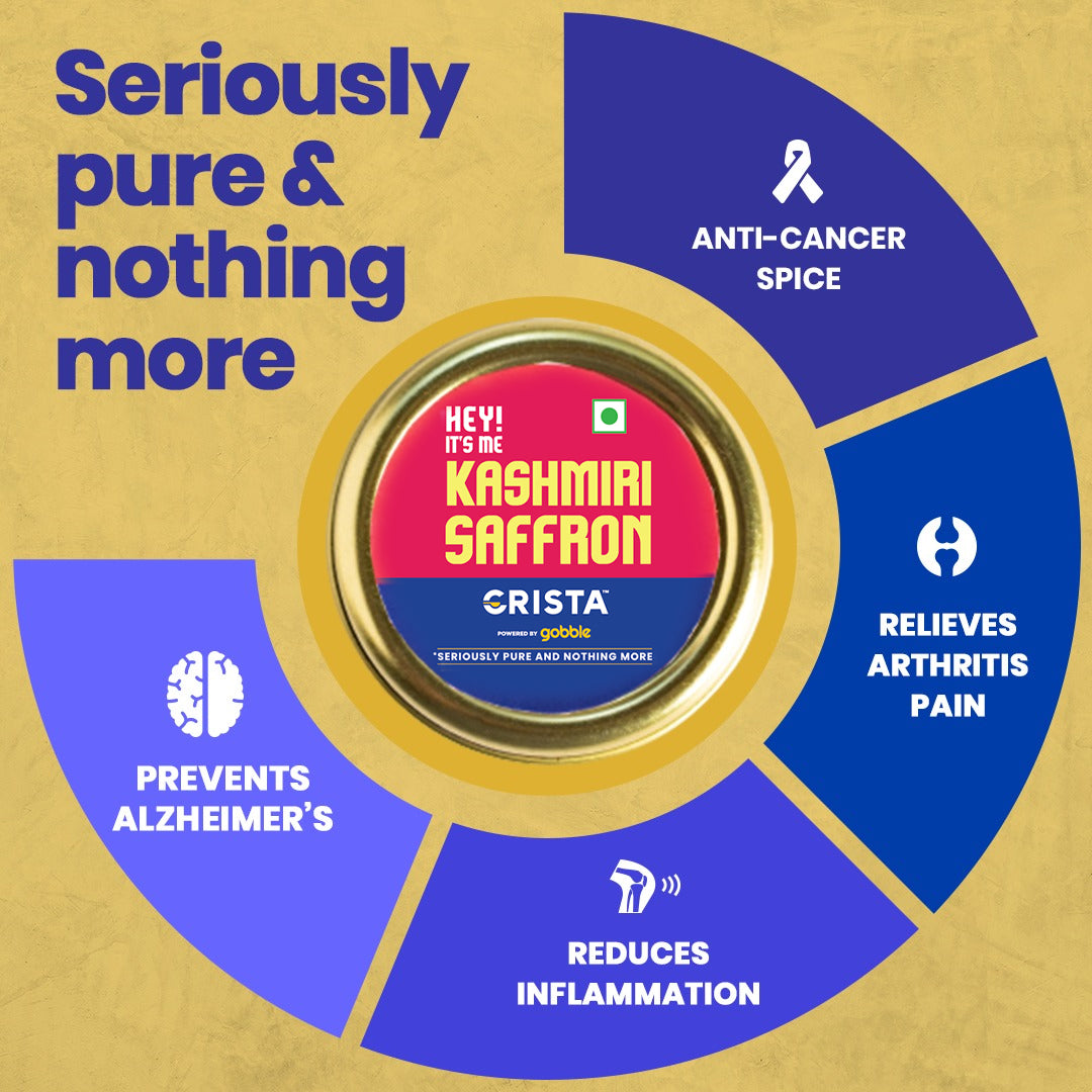 Hey! Its me Kashmiri Saffron. Proud of: My purity and rich flavour. Sourced from one of the most premium range farms in Kashmir, CRISTA Saffron adds a burst of flavour to dishes and desserts unlike any Saffron available in the local market. Saffron is one of the most expensive spices but is also known to suffer from adulteration. Solving one of the common problems of locally available saffron, which is known to possess extraneous matter, CRISTA production team utilizes decades of quality control measures to ensure 99.6% purity for this spice.