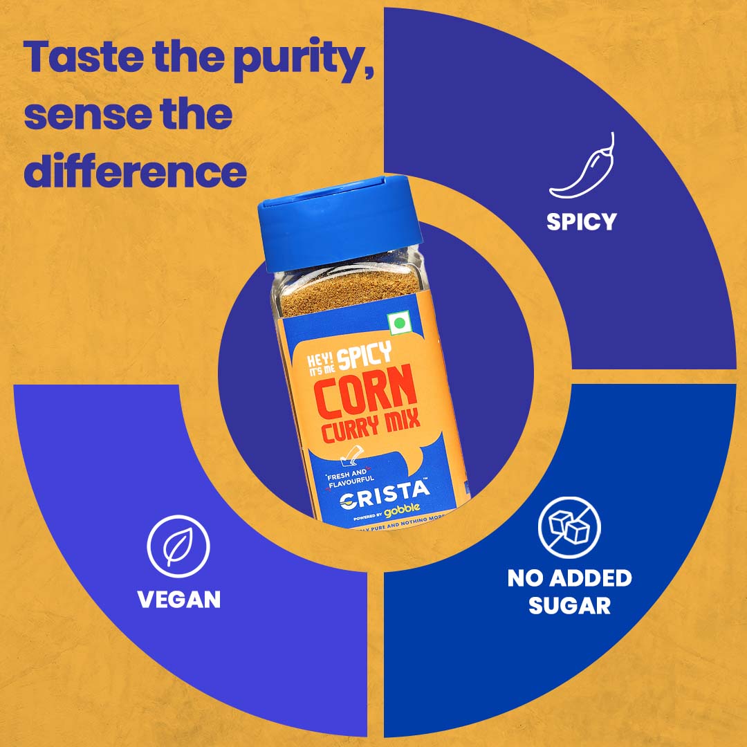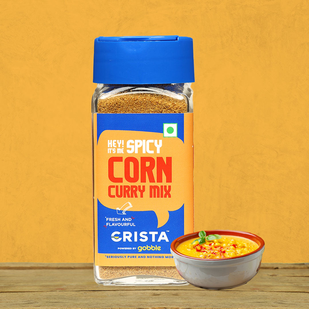 Hey! Its me Spicy Corn Curry Mix. Inspired by our much-revered Founderâs love for corn, this proprietary spice blend is popularly used to make corn curry. However, the versatility of this blend allows it to also act as an excellent seasoning for sautéed vegetables like zucchini, broccoli, string beans or as a coating for chicken and beef. CRISTA Spicy Corn Curry Mix is freshly machine ground using our sophisticated hammer crushers and micro pulverisers. It is subsequently mixed in an automatic GMP blender to achieve the desired balance and consistency.