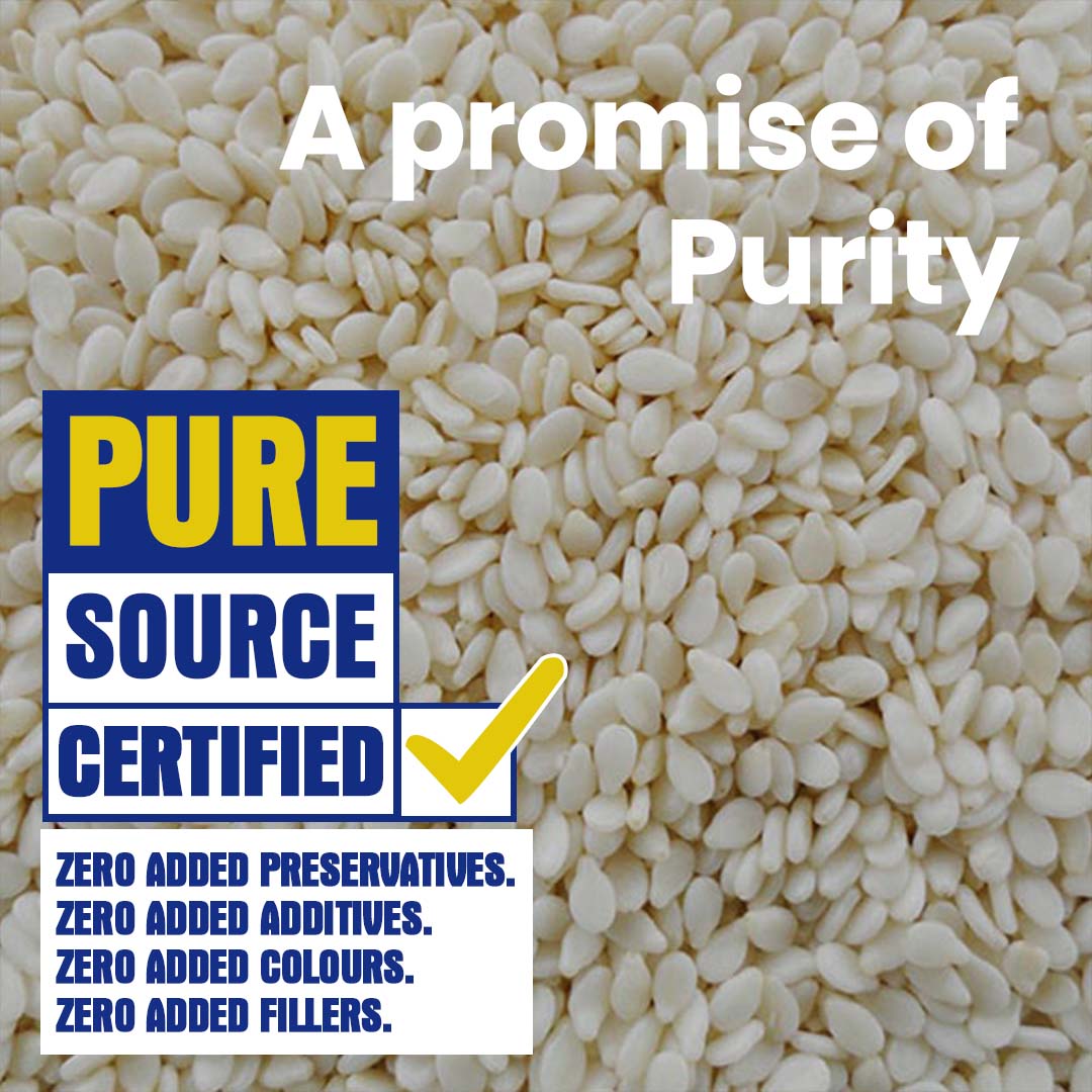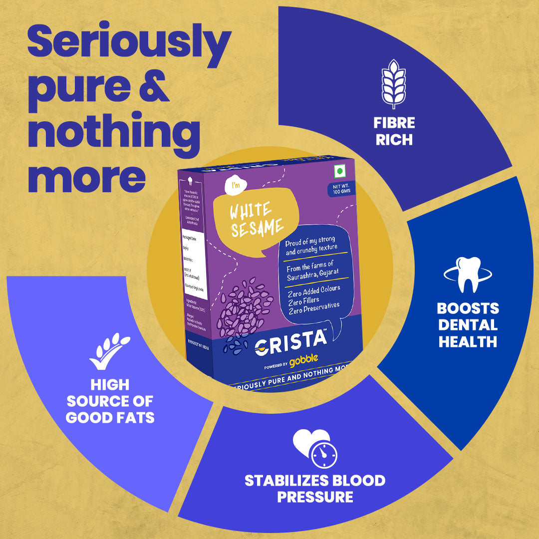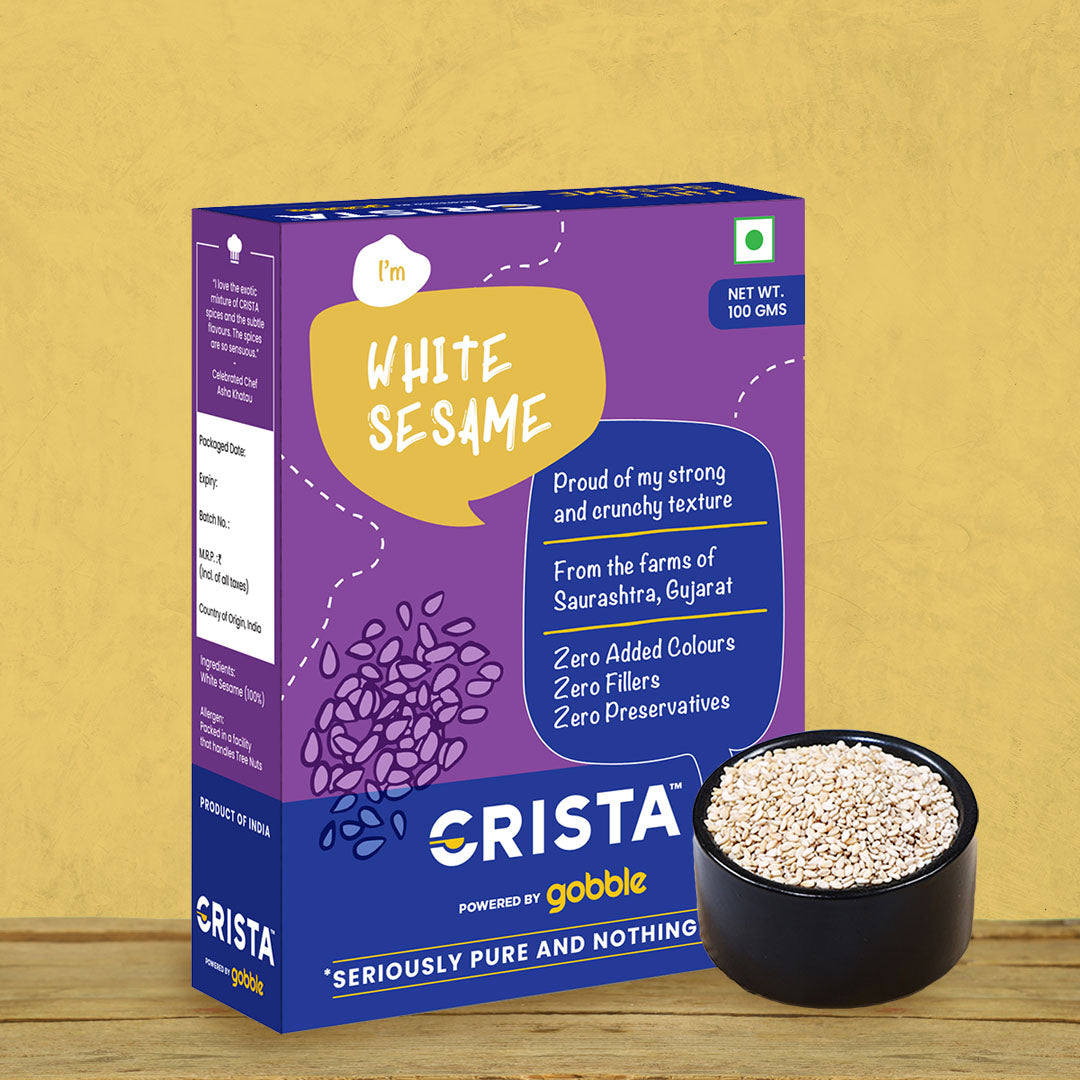 Hey! Its me White Sesame. Proud of: My crunchy texture. Premium quality, natural, dry White Sesame Seed is sourced from farms of Gujarat. The spice is then transported to the factory where it is graded and processed. CRISTA Sesame is sortex grade implies export quality, solving one of the common problems of locally available sesame which is often adulterated and known to possess extraneous matter and has been a traditional pain point for the consumer who is forced to spend considerable time cleaning the notoriously tricky spice before usage in food.
