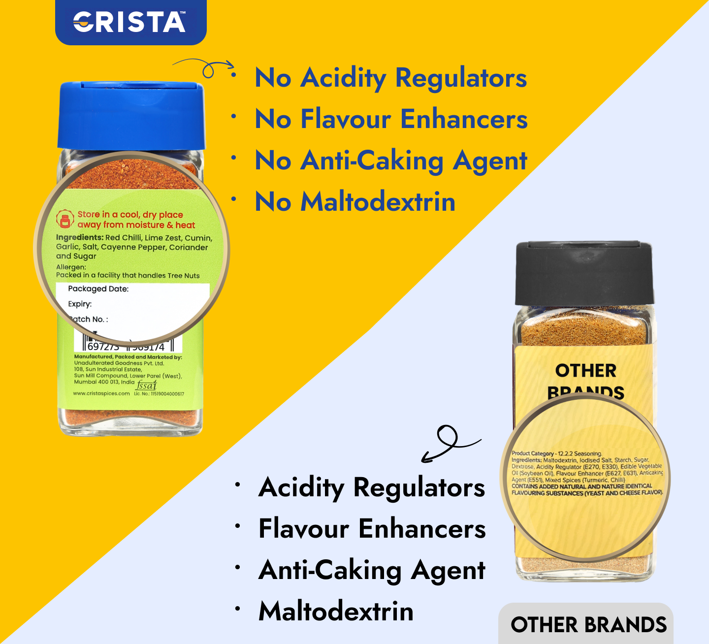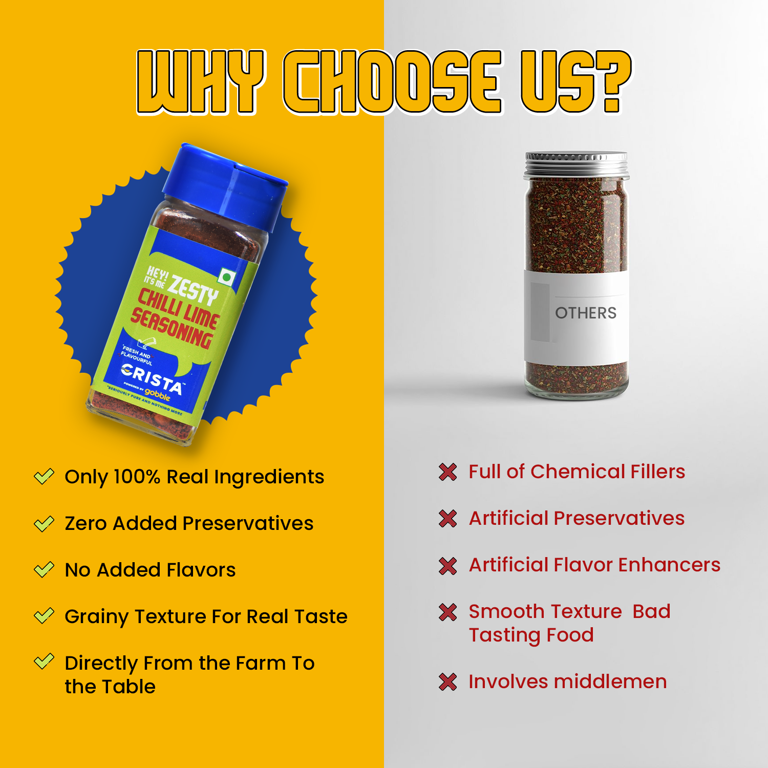 Hey! It's me, Zesty Chilli Lime Seasoning. Versatile yet complex, with the perfect balance of tangy and spicy, CRISTA Zesty Chilli Lime Seasoning is the perfect sprinkle on fresh fruits, veggies, fajitas, french fries, potato wedges, corn on the cob or baked salmon. A must have seasoning and one that can be enjoyed across generations, be it for young adults, Gen Z consumers, millennials, this multipurpose seasoning is packed with chatkaredaar lemon and chilli flavour!